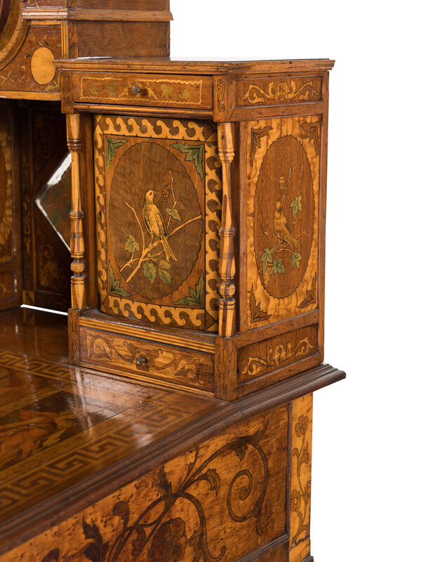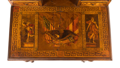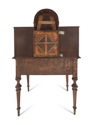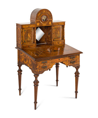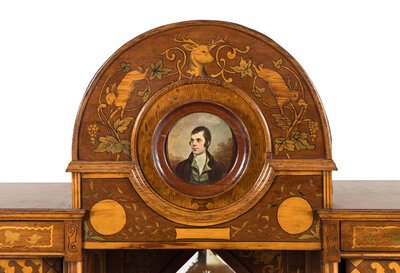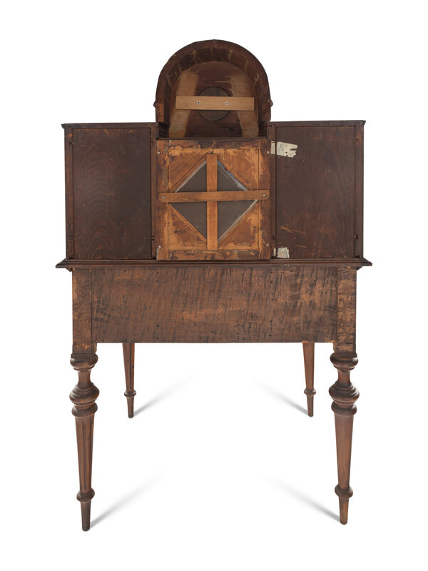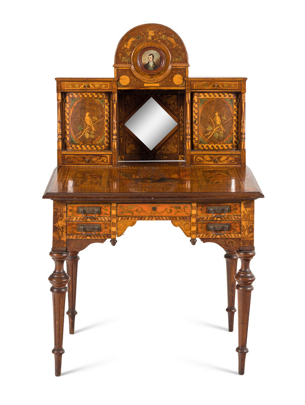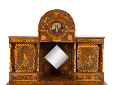in two parts, the upper gallery with detachable arched and domed pediment having central roundel containing printed portrait of Robert Burns (1759-1796) by Alexander Nasmyth (Scottish, 1758-1840), surrounded by deer head, rabbits, and grapevine, over two bowed doors above drawers, flanking central diamond-shaped beveled mirror, the doors and side panels inlaid with birds on grapevines, the lower section with slanted writing surface inlaid with maker's initials, "GM," and emblazoned eagle against American and Danish flag, flanked by depiction of Mercury and Minerva, bordered by Greek Key, above three short drawers, on turned fluted legs.