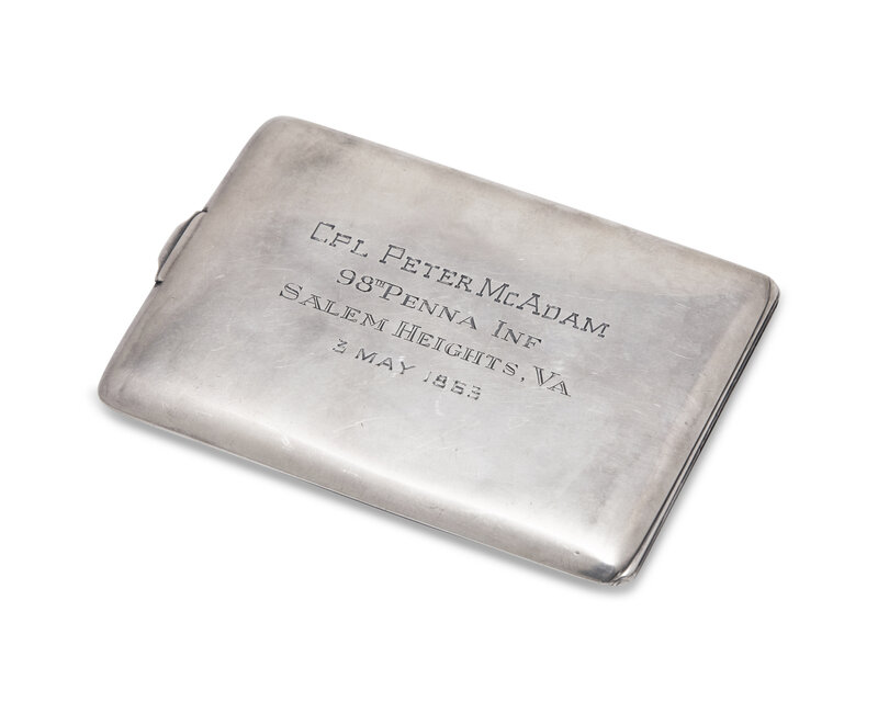 one side engraved with emblazoned American eagle, the other side engraved, "CPL Peter McAdam/ 98th Penna Inf/ Salem Heights, VA/ 3 May 1863," gilt-washed interior, marked to inside.