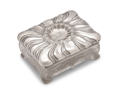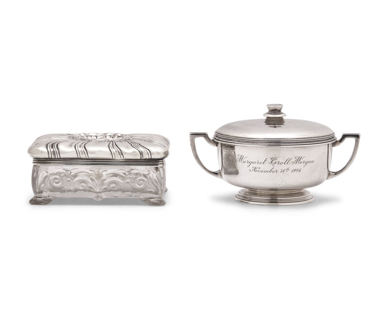 comprising a dressing box with cut glass base, by Tiffany & Co., the sterling silver lid with swirling motifs and rocaille reserve engraved with monogram, "JSM Jr.", the edge of lid marked, including "T" indicating directorship of Charles L. Tiffany (1892-1902); and a covered sugar dish with two handles, by Mappin & Webb, engraved to body, "Margaret Croll Morgan/ November 30th, 1926", marked to underside.
