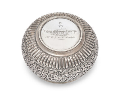comprising a coffeepot, a teapot, a covered sugar dish, a creamer, and a waste bowl, each cast and chased allover with foliate motifs, engraved to undersides, "Elisa Bishop Emery/ 1856 Oct. 22nd 1881./ from/ H.R. & M.C. Bishop", marked.