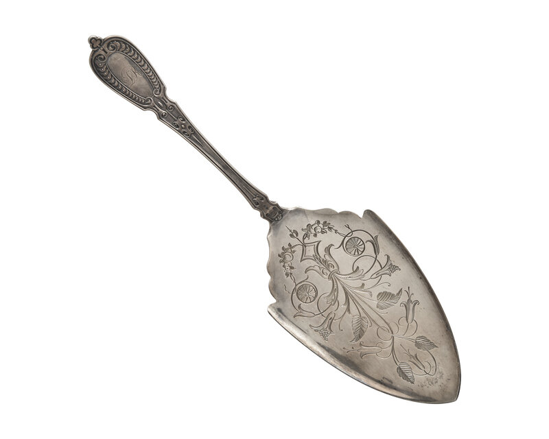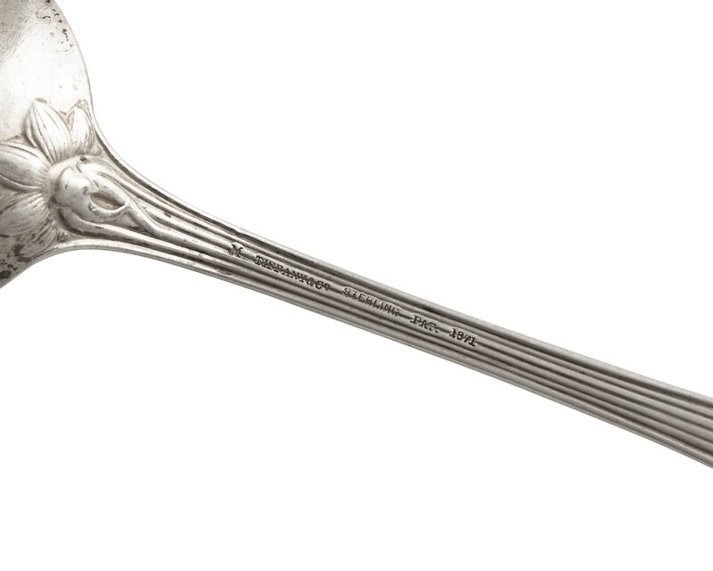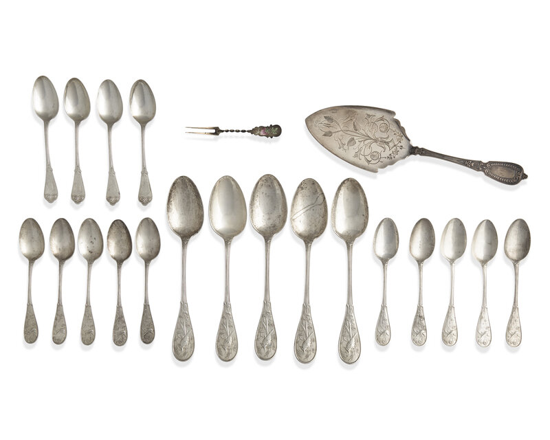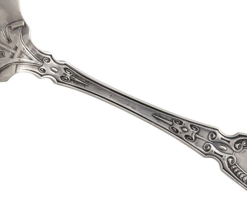 comprising five tablespoons and eleven teaspoons in the "Japanese" pattern, circa 1871, designed by Edward C. Moore the tablespoons engraved with monogram, "CLT", and the teaspoons engraved with monogram, "CLJ", marked; four teaspoons in the "Tiffany" pattern, designed by Edward C. Moore, circa 1869, engraved with monogram, "HCL", marked; and a cake knife in the "Armor" pattern by John Polhamus, circa 1860, with Tiffany & Co. leather retail case; sold together with a gilt-washed sterling silver olive fork, decorated with enamel strawberry, marked "Sterling"; accompanied by wood storage case.
