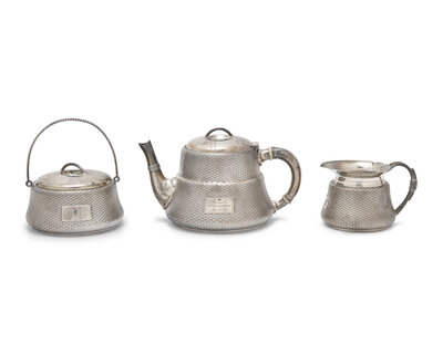 comprising a teapot, a creamer, and a covered sugar dish, the teapot engraved, "Presented to Wm. H. Carter./ May 15th 1885.", and the creamer and covered sugar dish engraved with monogram, "WHC", all marked.