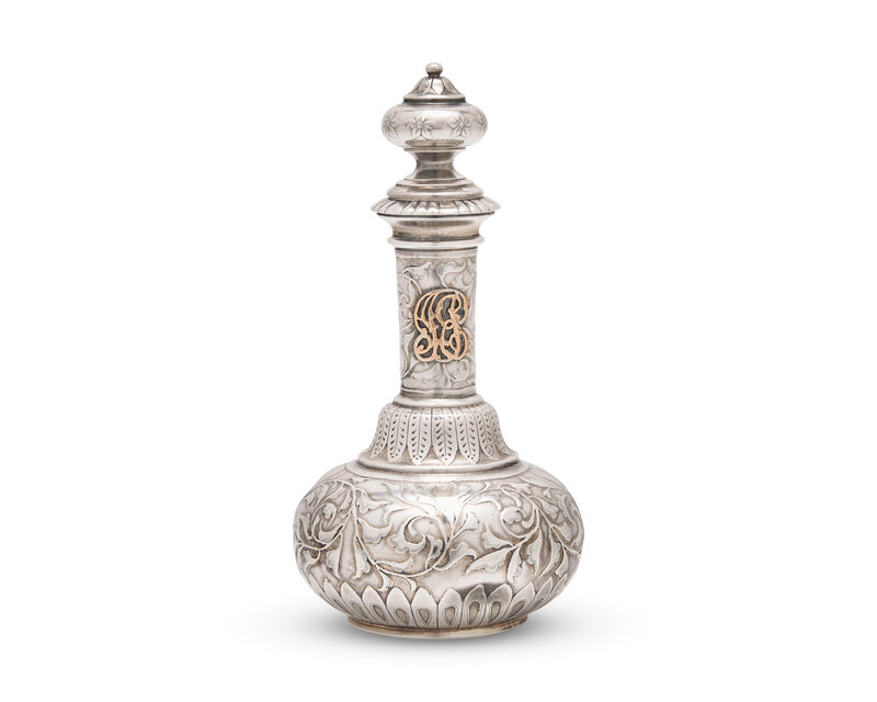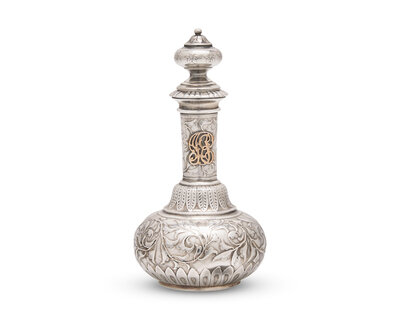 An Aesthetic Movement Sterling Silver Acid-Etched and Gilt-Overlay Stoppered Perfume Bottle