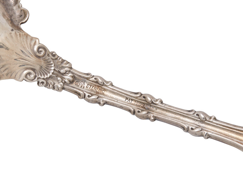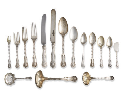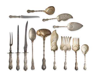 comprising twelve dinner knives, eleven luncheon knives, five butter spread knives, twelve dinner forks, seventeen luncheon forks, eleven pastry forks, four salad forks, twelve seafood forks with gilt-washed ends, twelve tablespoons, six teaspoons, twelve shell teaspoons with gilt-washed bowls, one melon spoon, three serving spoons, one serving spoon with gilt-washed shell-form bowl, one stake, a carving fork, two carving knives, three fish or cake servers / knives (one with gilt-washed blade), a tomato or vegetable server with gilt-washed tongs, a punch ladle with gilt-washed bowl, three perforated or scalloped ladles / spoons of various forms, a salad serving spoon and fork with gilt-washed ends, and a serving spoon with gilt-washed shell-formed bowl, all engraved with monogram, "KLD", marked; sold together with a large silver-plated serving spoon and melon spoon, the melon spoon engraved, "1885/ B.M.C/ 1985" and marked "Sheffield England." (136 items total).