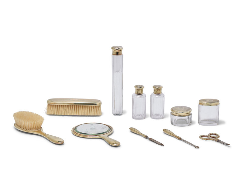 comprising two brushes, a comb, a hand mirror, nail file, a button hook, five cut glass and lidded perfume or makeup bottles, and a scissors, engraved with monogram, "APH", marked, "14K", housed in fitted silk-lined leather box with two small leather case.