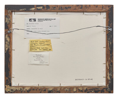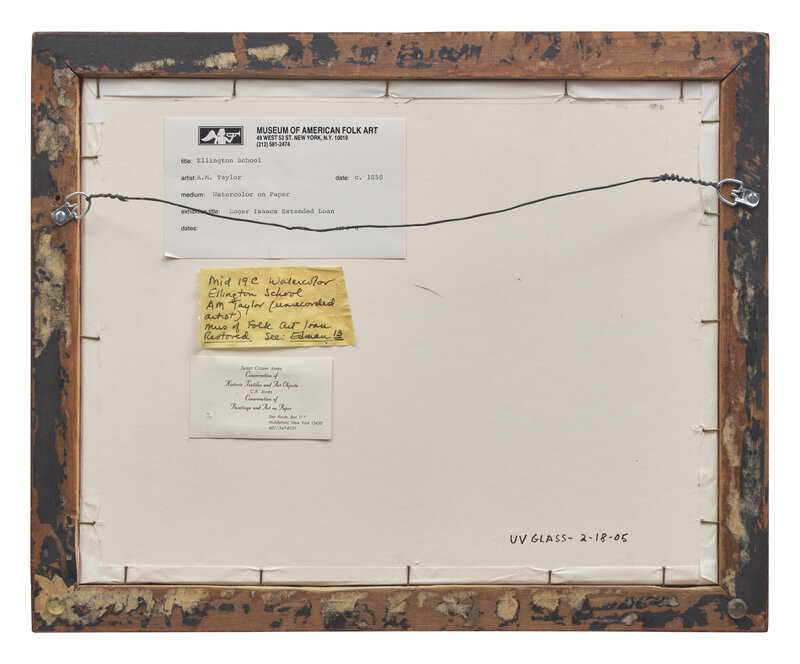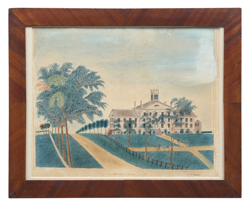 ink, watercolor, and pencil on paper, matted and framed, inscribed, "Ellington School", center bottom, and signed, "A M Taylor", l.r., verso bearing Museum of American Folk Art label inscribed, "Ellington School/ A.M. Taylor/ c. 1850/ Watercolor on paper/ Roger Isaacs Extended Loan/ cat # 6", also with label inscribed, "Mid 19 C Watercolor/ Ellington School/ AM Taylor/ unrecorded artist)/ Mus of Folk Art loan/ Restored See: Edman 13".