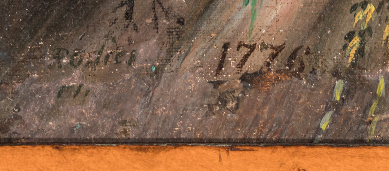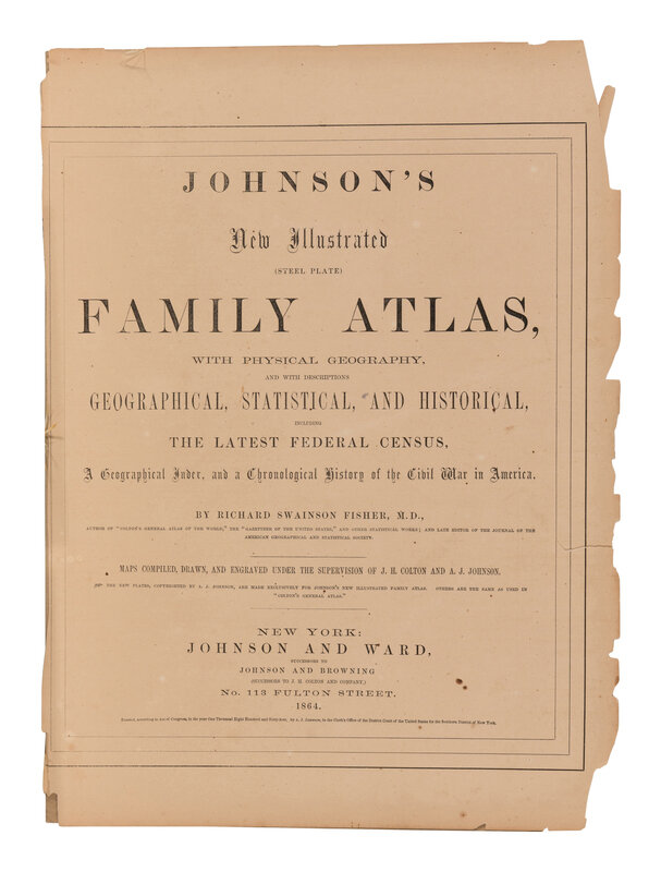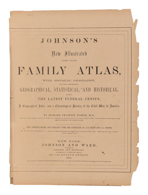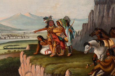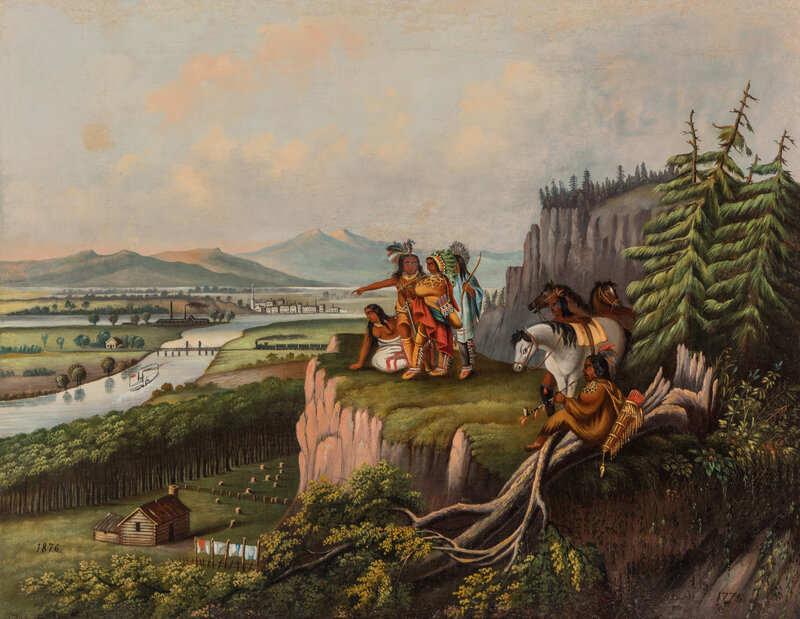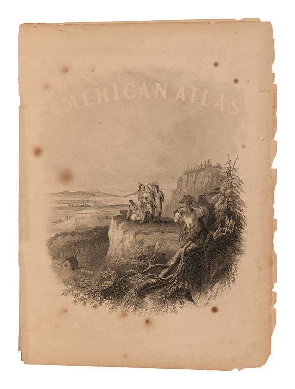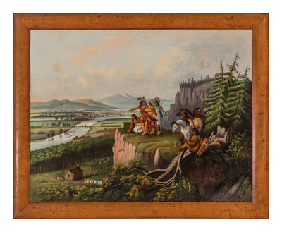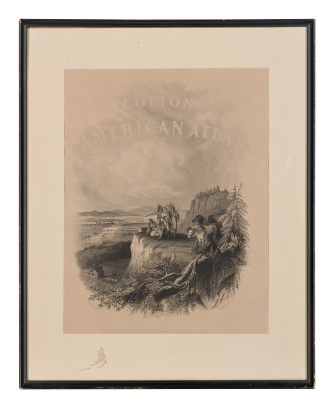 after the work by C.E. Doepler, signed, "Rodier", l.r., dated, "1876", l.l., and "1776", l.r., with Museum of American Folk Art label verso, typed, "Indians in a Landscape Overlooking a Valley/ A. Rodier/ 1886/ Oil on canvas/ Isaac Rogers extended loan/ cat # 4", also with label inscribed, "Late 19 C oil on academy boarad/ Signed A. Rodier/ C. 1856/ Birds Eye Maple Frame/ Edman No. I", oil on canvas mounted to academy board, framed; sold together with a matted and framed copy of the engraved frontispiece of Colton's American Atlas, published by J.H. Colton, New York, New York, 1855, by C.E. Doepler, engraved by C. Wise, and a few loose pages from Johnson's New Illustrated Family Atlas, Johnson & Ward, New York, New York, published 1864.