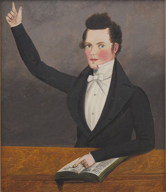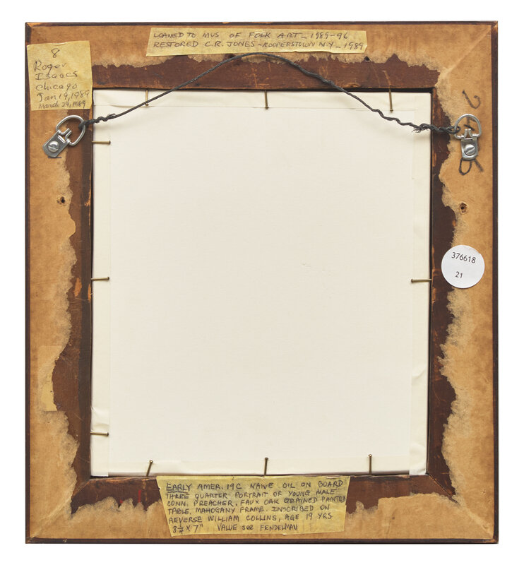 oil on board, framed, the verso bearing labels inscribed in ink, "8 Roger Isaacs/ Chicago Jan 19, 1989/ March 294, 1989", "Loaned to Mus. of Folk Art- 1989-96/ Restored C.R. Jones/ Cooperstown N.Y.-1989", and "Early Amer. 19C Naive Oil on Board/ Three Quarter Portrait of Young Male/ Conn. Preacher, Faux Oak Grained Painted/ Table. Mahogany Frame. Inscribed on/ Reverse William Collins, Age 19 yrs./...Value see Fendelman."