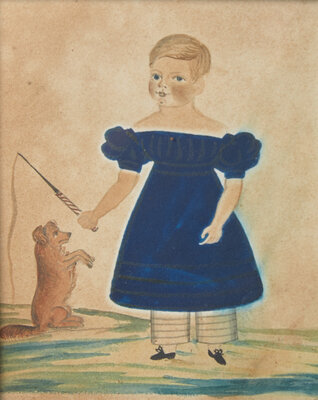 depicting a boy with whip and dog, and a girl holding a book, watercolor and ink on paper, framed.