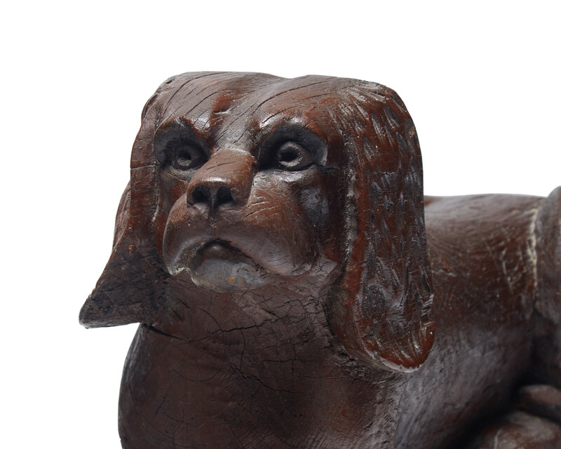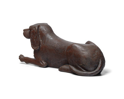 A Carved and Brown- Painted Figure of a Reclining Spaniel