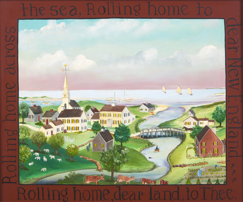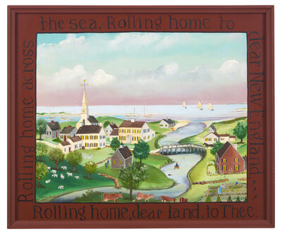 the frame inscribed, "Rolling home, dear land, to thee. Rolling home across the sea, Rolling home to dear New England,...", oil on panel, exhibition label with artist name and medium on verso, framed.