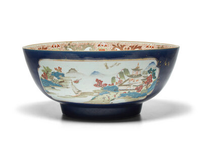 decorated with landscapes in reserves on a cobalt blue ground, the interior with floral motifs.