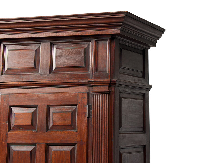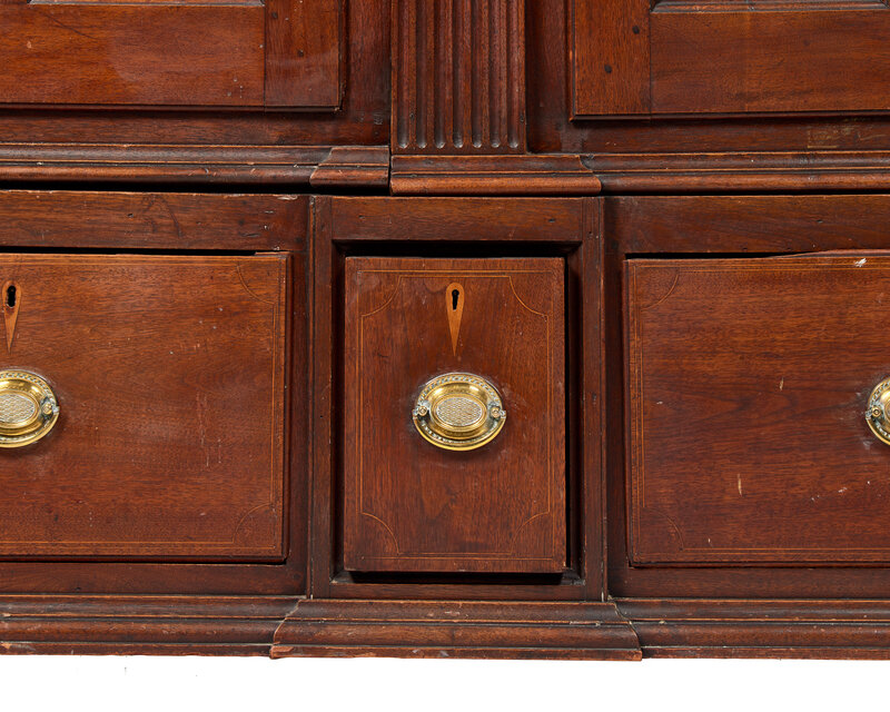 in four parts, with lift-off molded and paneled cornice, over two sections, each composed of paneled door flanked by fluted pilasters, revealing shelves and wall pegs, on molded base with five inlaid drawers, on French feet.