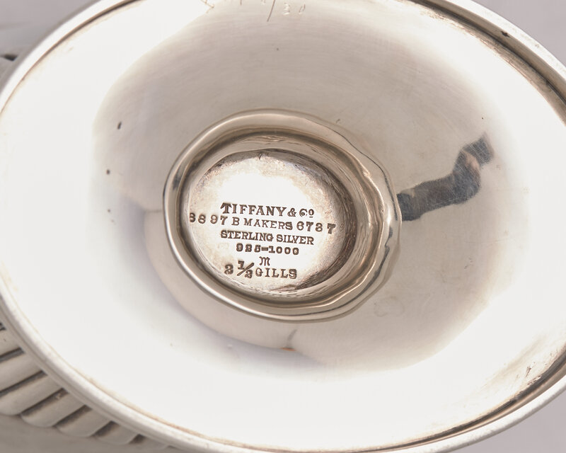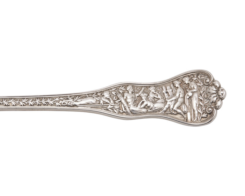 comprising a creamer, by Tiffany & Co., New York, New York, early 20th century, engraved with monogram, "JJA", marked to underside including "M" mark indicating directorship of John C. Moore II (1907-1947); a tablespoon in the "Olympian" pattern, by Tiffany & Co., New York, New York, late 19th century, engraved with monogram, "JJA Jr.", marked; a set of seven Elizabeth II cream soup spoons, by Cooper Bros. & Sons, Sheffield, 1954, engraved with monogram, "BA", marked; a William IV punch ladle, by Jonathan Hayne, London, 1830, bearing engraved Astor family crest in the form of a falcon, marked; and a set of three coffee spoons, by Lionel Alfred Crichton, London, 1911, bearing engraved Astor family crest in the form of a rearing lion holding star, marked.