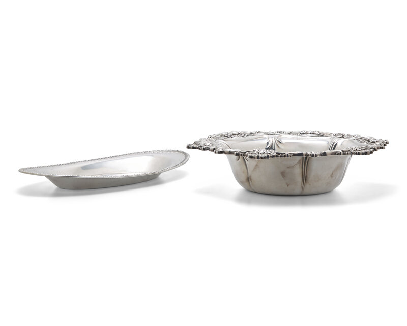 the bowl with scalloped and cast foliate rim, by J.E. Caldwell & Co., marked; the silver tray with gadrooned rim, by Manchester Silver Co., marked.