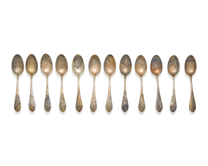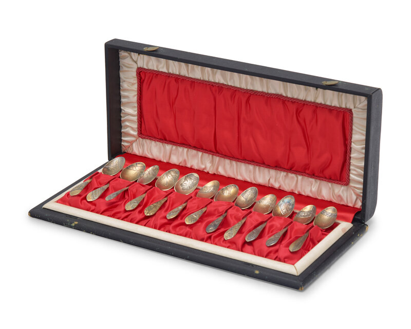 A Cased Set of Twelve Aesthetic Gilt-Washed Sterling Silver Coffee Spoons