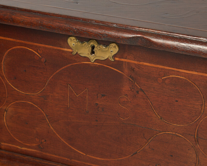 decorated with inlaid tulips and berry motifs, the front inlaid with initials, "MS", iron strap hinges, the interior with lid-less till, on bun feet.
