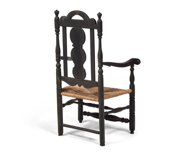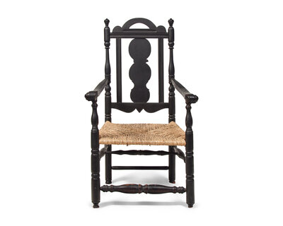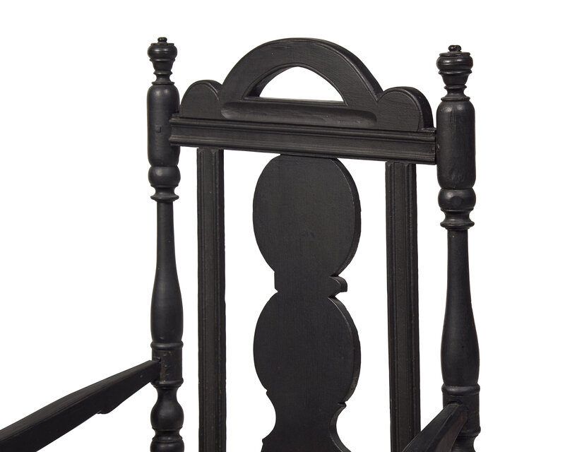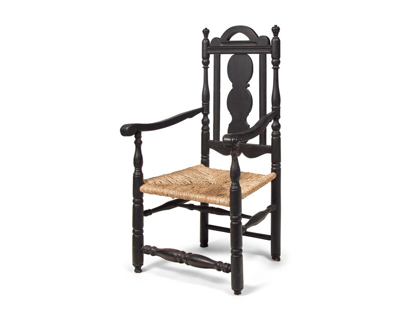 made for Reverend Abel Morgan (1713-1785), pastor of the Middletown Baptist Church; displaying elaborate turnings, a shaped splat, and "ram's horn" armrest terminals, retaining old black paint, with rush seat.