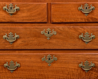 in two parts, the upper section with flat molded cornice, over a series of three short drawers above two short drawers, over four graduated long drawers, the lower section with waist molding on shaped apron, with cabriole legs ending in trefid feet.