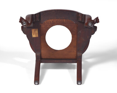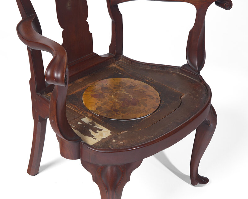 fitted as a commode chair, with lambrequin carved knees and trifid feet.