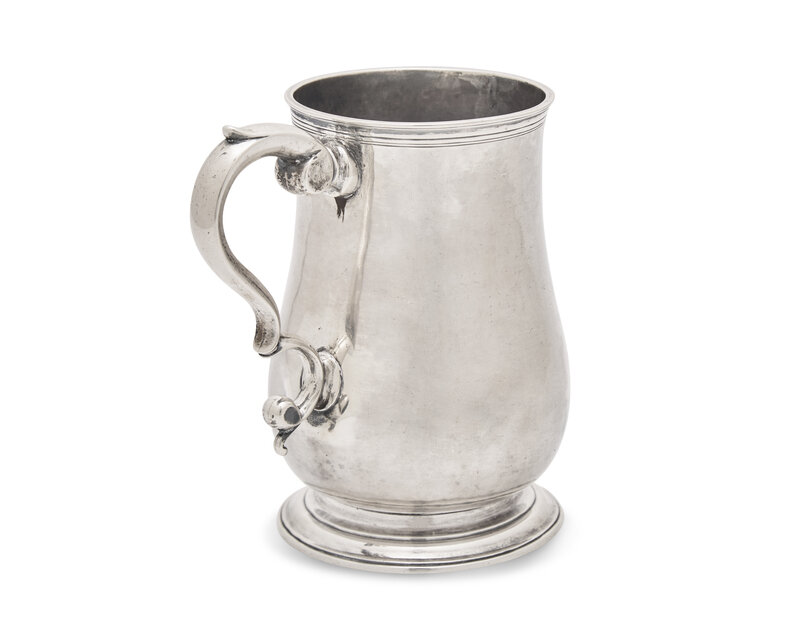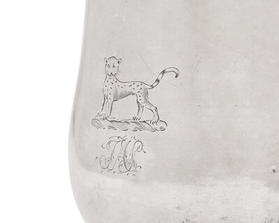 of baluster form with scrolled handle, with molded rim and foot, the body bearing engraved armorial crest in the form of a leopard and monogram, "JAS", marked.