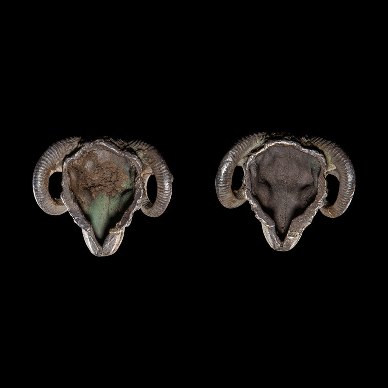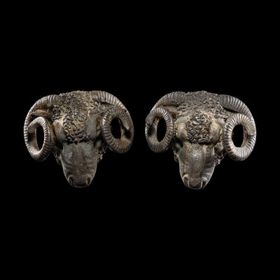 A Pair of Hellenistic Silver Ram's Head Appliques