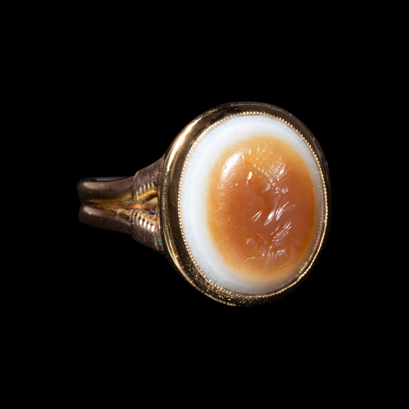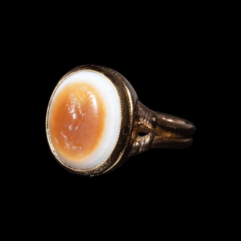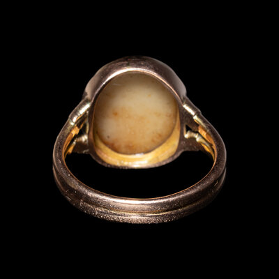 Width 2.3 cm (7/8 inch); Ring size 9 1/4; 14 karat gold; 7.14 grams.