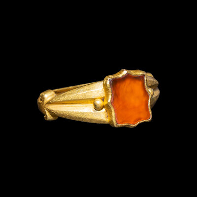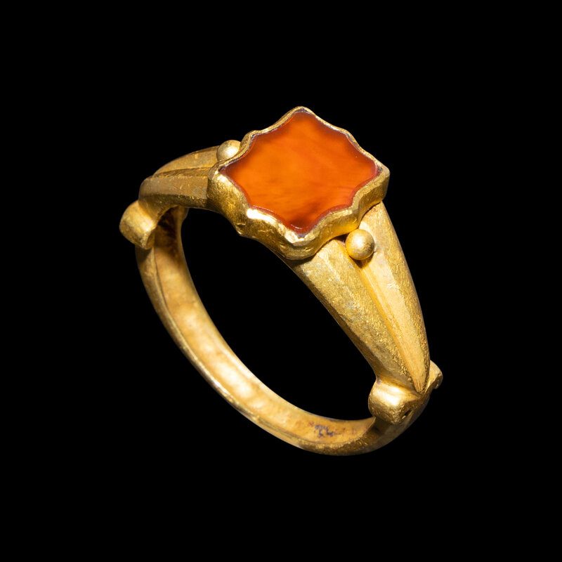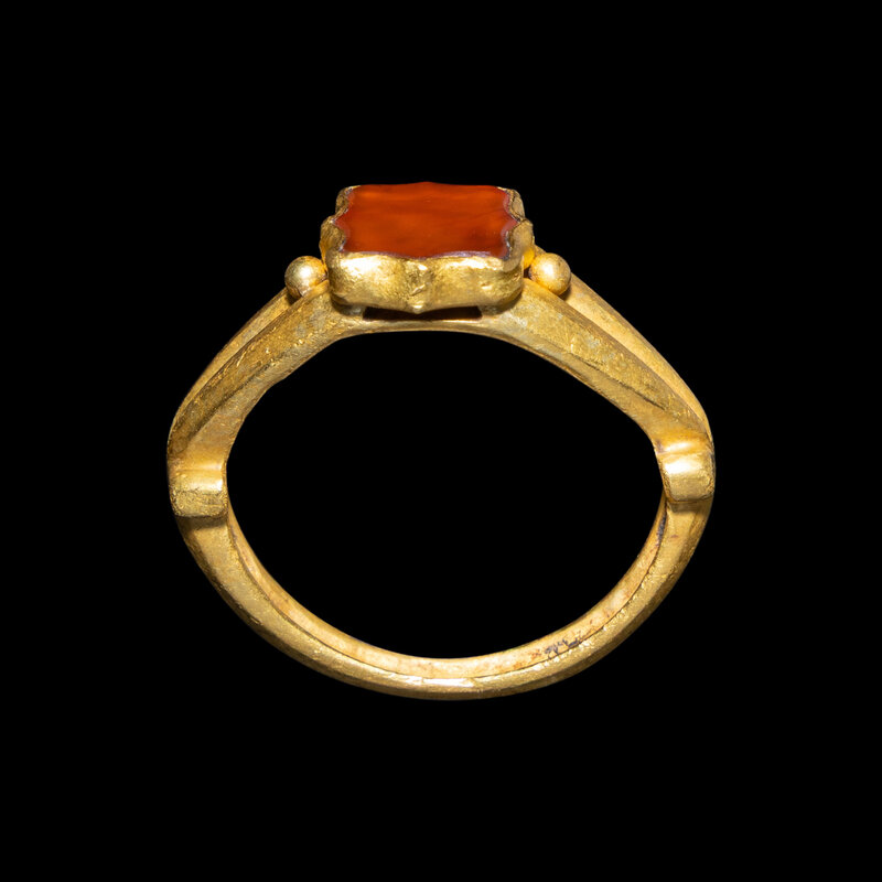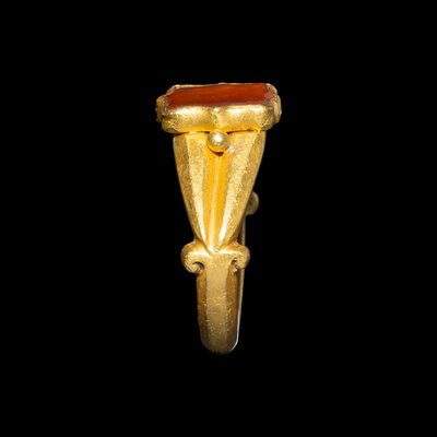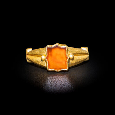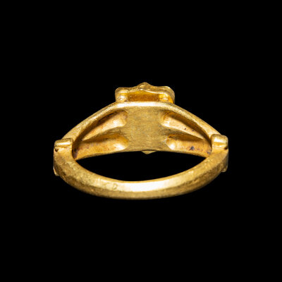 Width 2.7 cm (1 1/8 inches); Ring size 8 3/4; High karat gold; 9.44 grams.