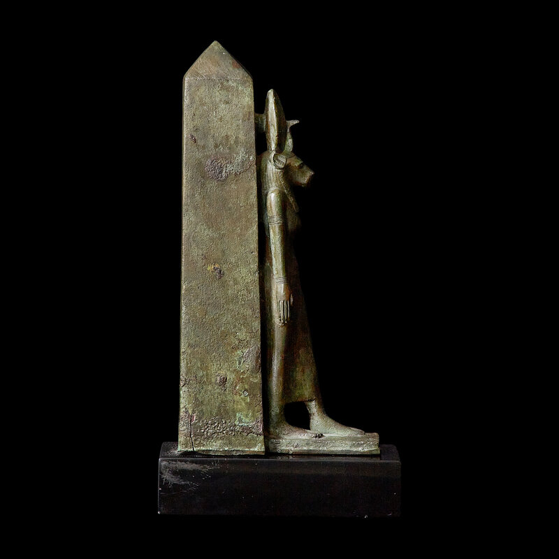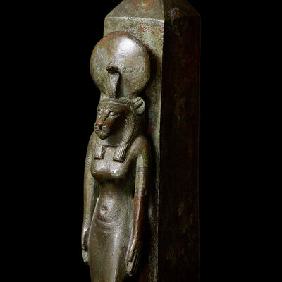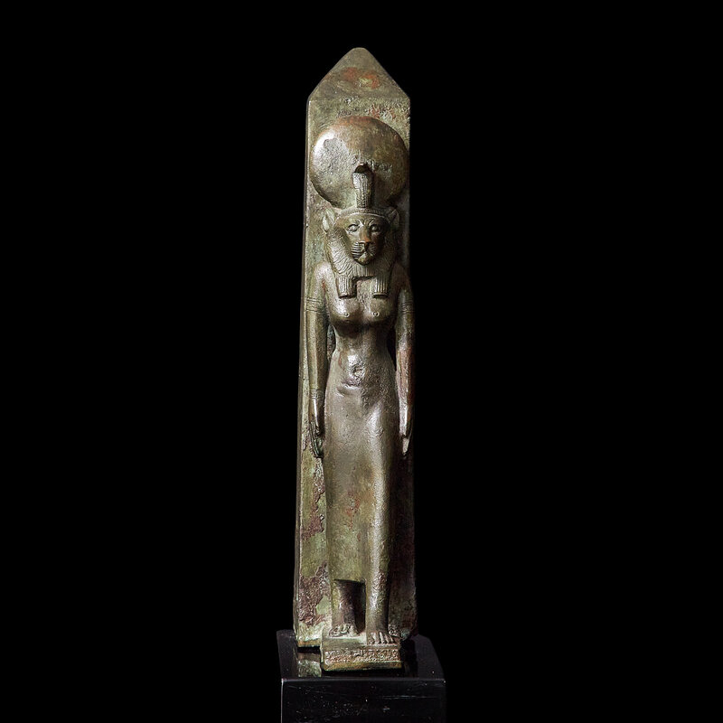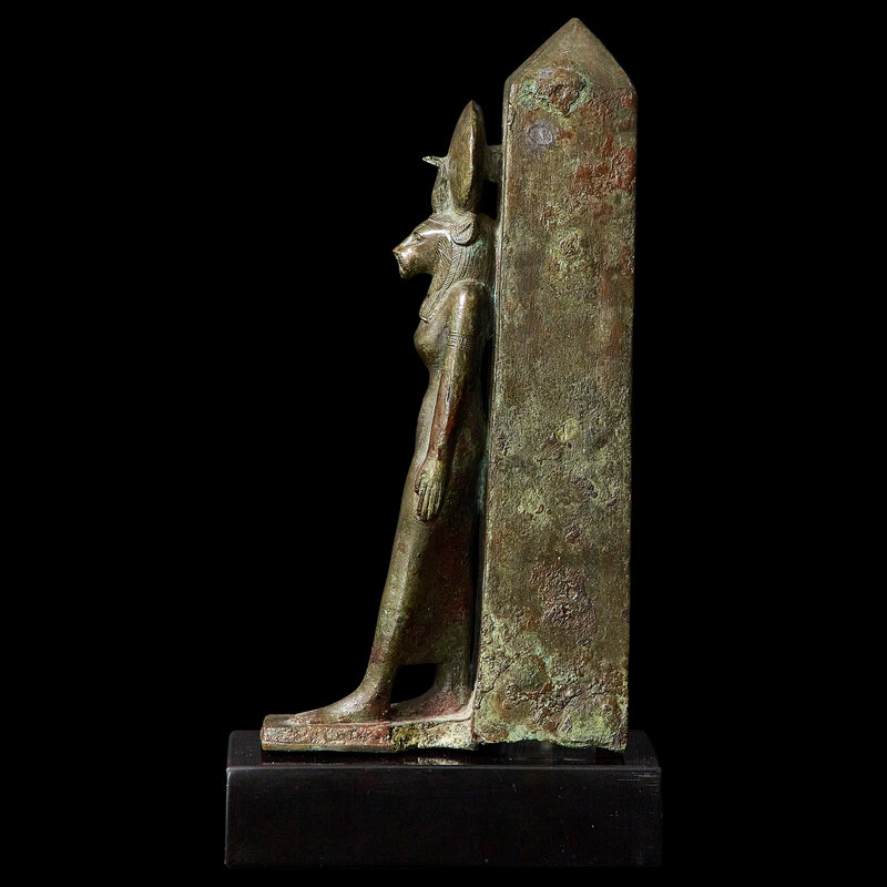 An Egyptian Bronze Lion-Headed Goddess and Obelisk