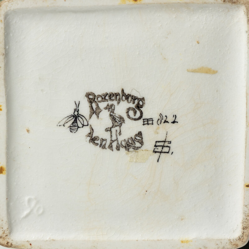 The underside with printed gray stork mark (no crown) “Rozenburg den Haag”; and black painted artist’s monogram ($), date mark (bee symbol), and window next to order mark “822”; embossed model no. “90” mark.