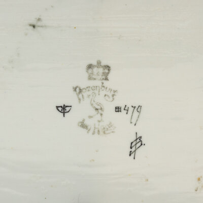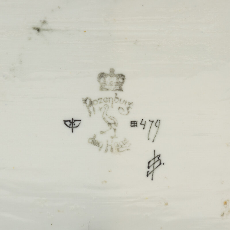 The underside with gray printed crown & stork “Rozenburg den Haag” mark, black painted artist's monogram (“$.”), date mark (butterfly symbol), and window next to order “479” mark.