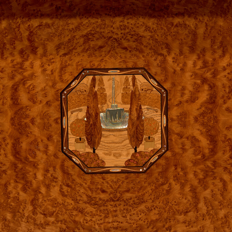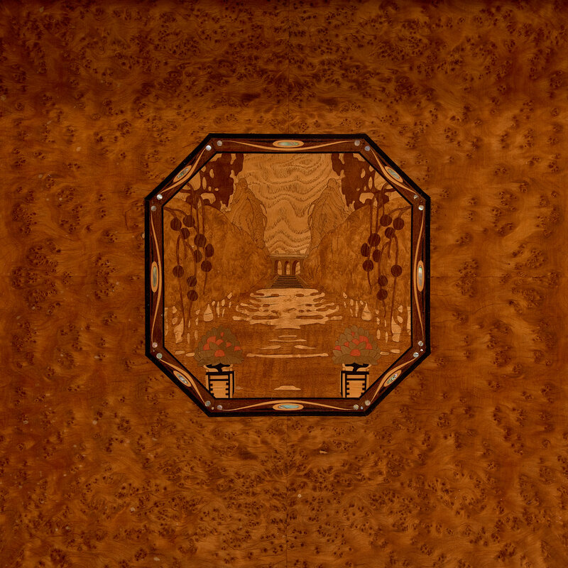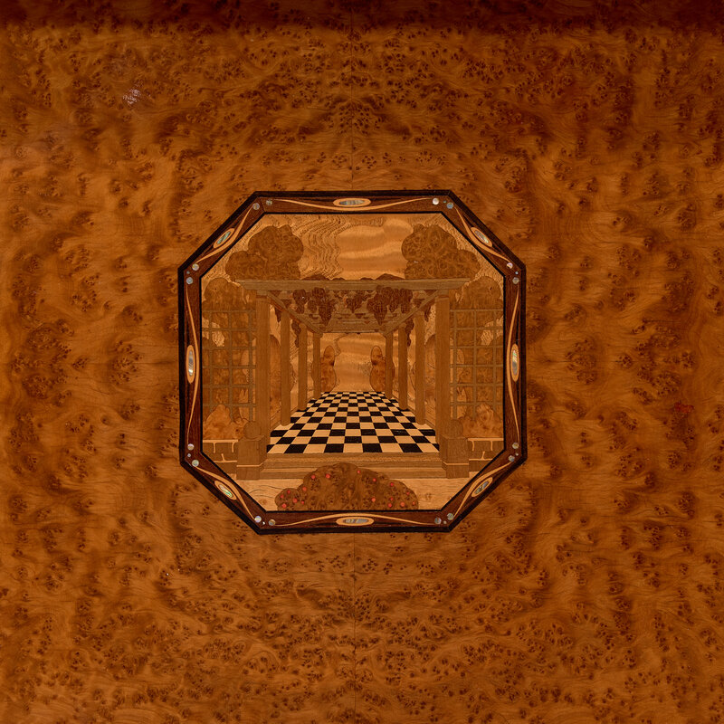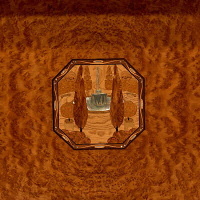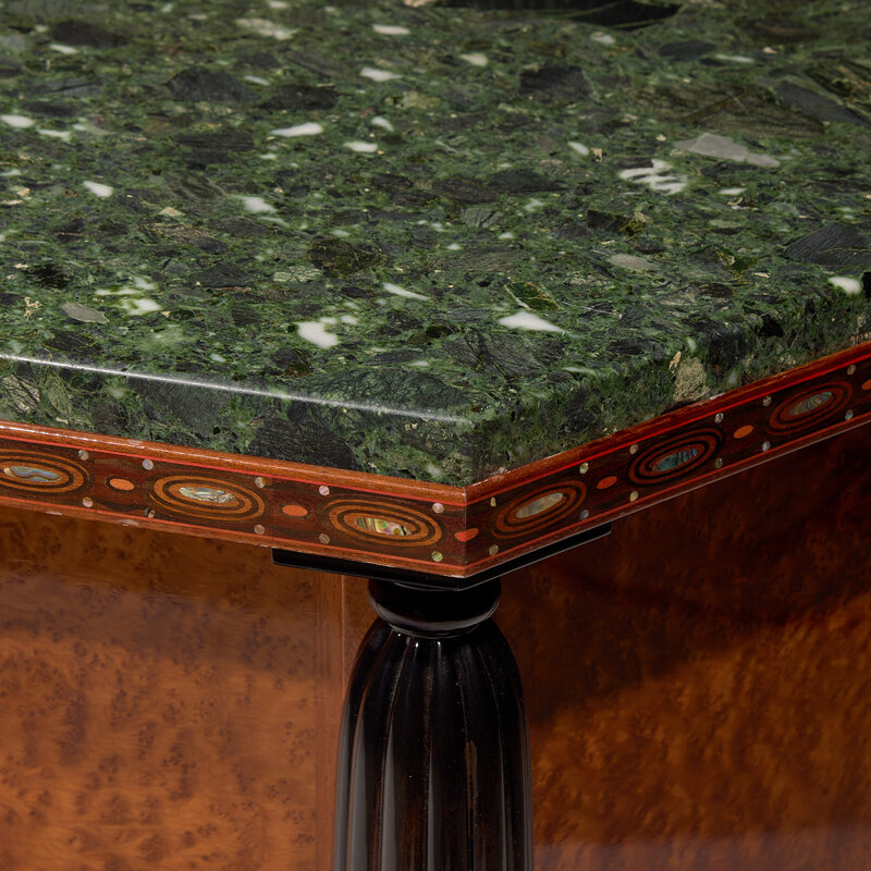 burl maple, mahogany, marble, inlay
