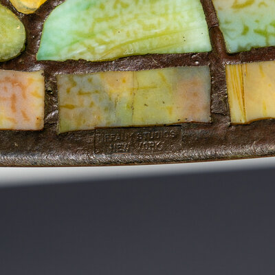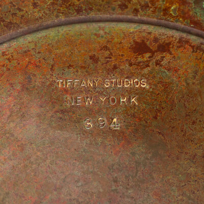 Signed inside shade rim 'Tiffany Studios New York'. Stamped to underside of base 'Tiffany Studios New York 394.'