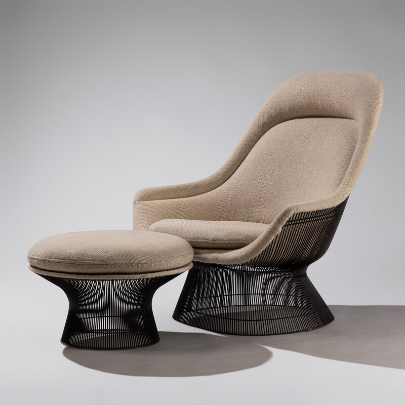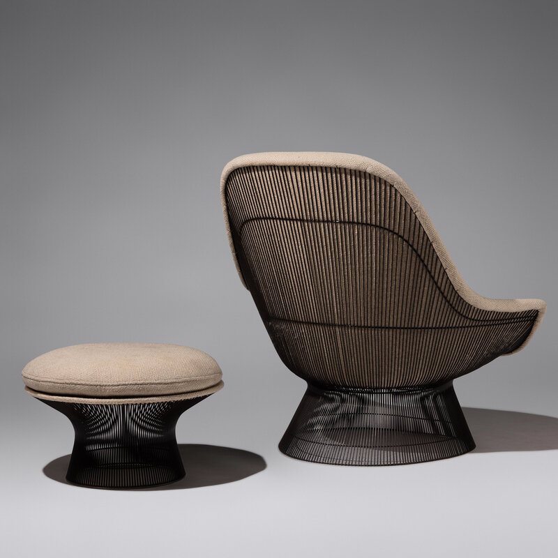 chair: 39 h × 41 w × 35 d in (99 × 104 × 89 cm) | ottoman: 15 h × 26 dia in (38 × 66 cm)