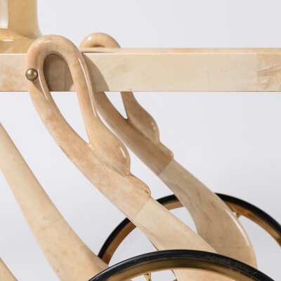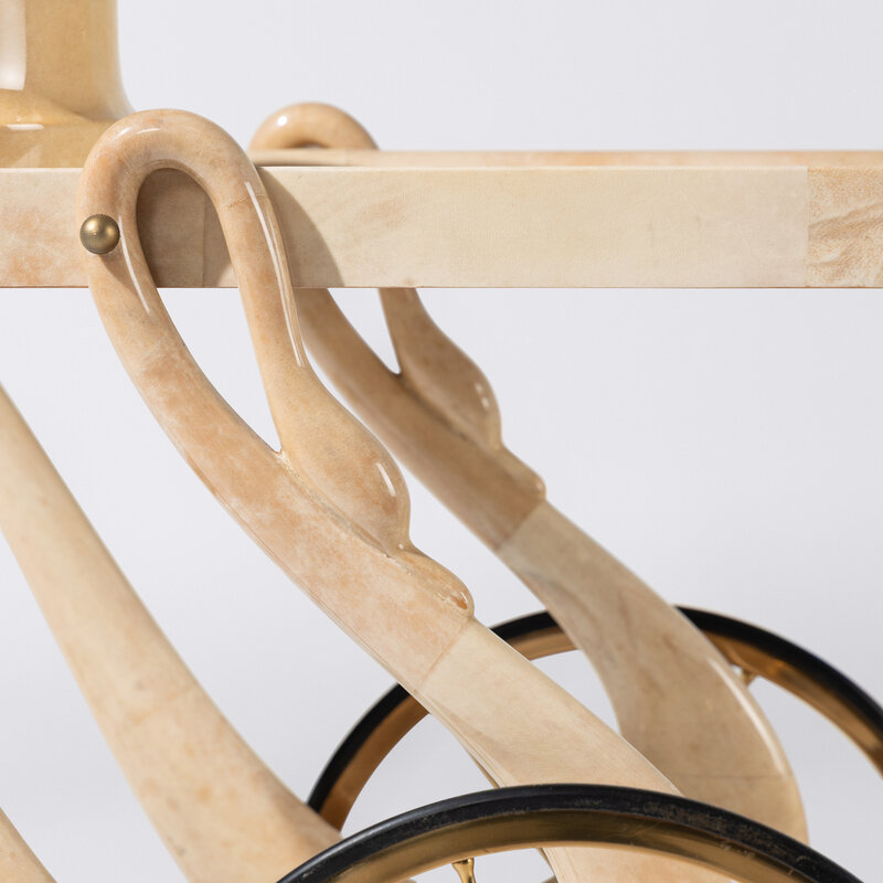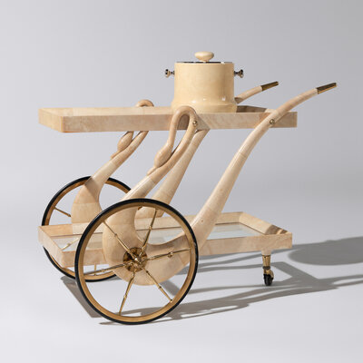Goatskin veneered Swan bar cart and ice bucket, c. 1958