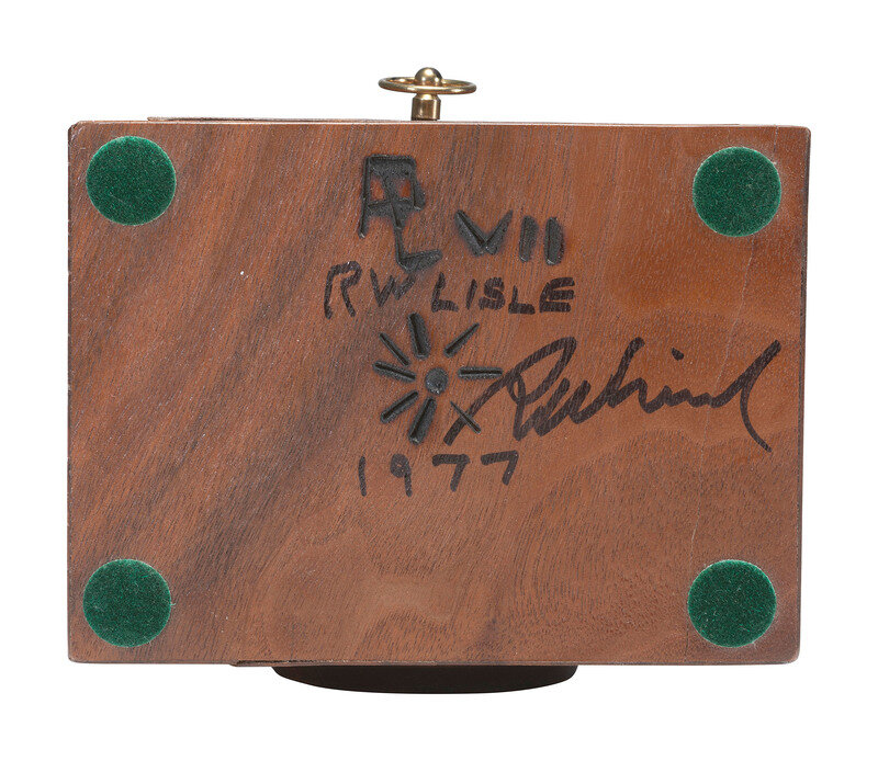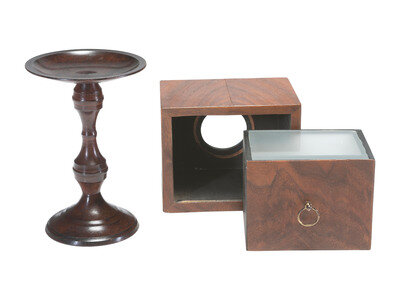 Wooden camera obscura with drawer in the back, size 3 5/8 x 4 x 5 in. Underside signed, "R.W. Lisle, 1977." Accompanied by stand, 6 in. ht.