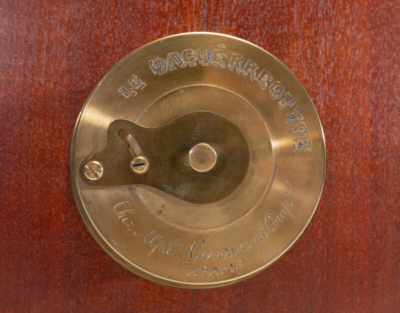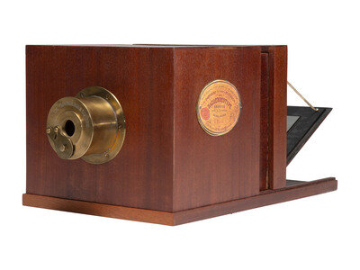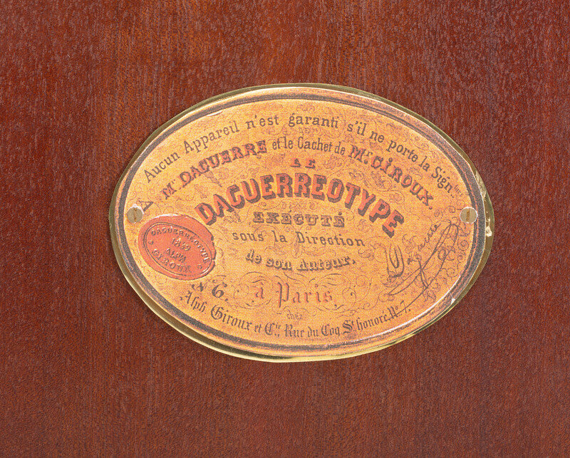 Replica of the 1839 daguerreotype camera produced by Alphonse Giroux, handcrafted in wood following period designs. Size 10 in. wide x 8 3/4 in. high x 16 in. deep (not including lens). Underside signed "R.W. Lisle, 1991." The lens engraved around the edge 'LE DAGUERREOTYPE, Ch Alph Giroux et Comp, a Paris,' with a copy of the oval label to one side, with 4 3/4 x 6 1/4 ground glass focal screen to the rear and mirror for vertical viewing, complete with one plate holder.