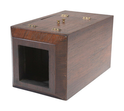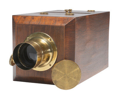 Replica chamfered box sixth plate daguerreotype camera, mahogany veneer, made by Robert Lisle, size 6 in. wide x 6 in. high x 11 1/2 in. deep (not including lens). Underside inscribed "R.W.L. 1980." With ground glass measuring 2 3/4 x 3 1/4 in. With early lens marked "Voigtlander & Son, Wien," no. 2765, accompanied by cap.