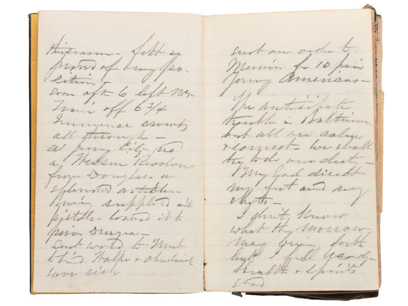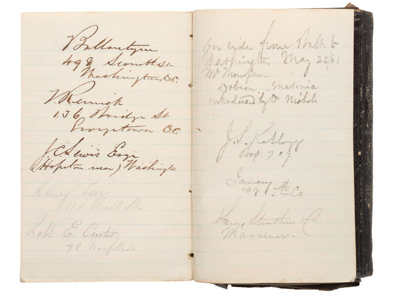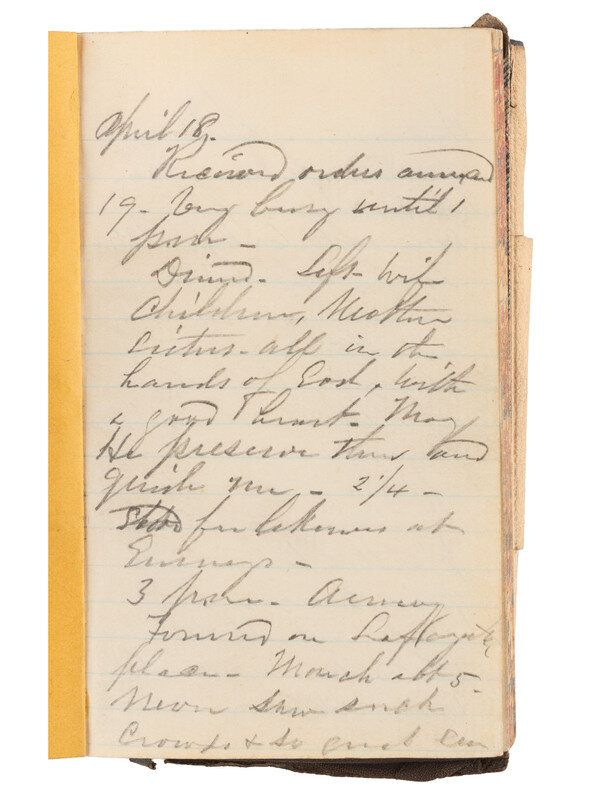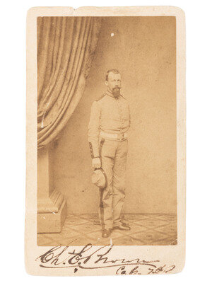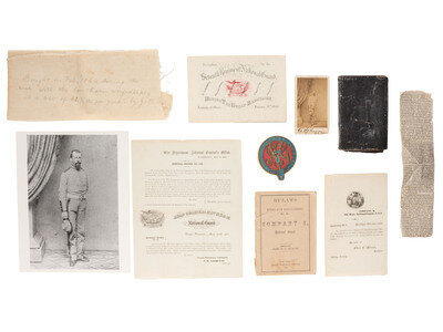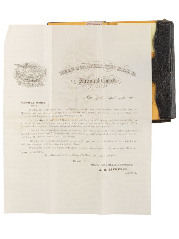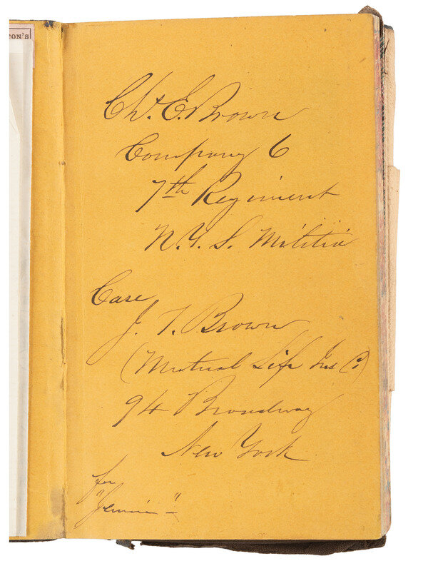 Group highlighted by: leather-bound soldier's diary, approx. 3 1/2 x 5 1/4 in., identified to "Chs. E. Brown / Company C / 7th Regiment / N.Y.S. Militia," 13 pp with entries dated 18-27 April 1861, +7pp additional notes, with 19 April 1861 mustering order attached to diary left front cover. -- Full standing portrait CDV of uniformed soldier, inscribed by Brown below image on mount "Chs. E. Brown / Co. C / 7th R." No backmark.