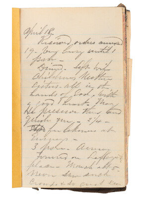 Charles Brown's diary covers the the brief, but consequential, period during which the regiment left New York at the onset of the war to assure the safety of President Lincoln and the nation's capital from Confederate forces. Brown describes preparations for departure, and his journey to DC: (April 19) "Immense crowds all the way through to jersey City. Got a Wesson revolver from Douglas...We anticipate in trouble but all are calm & earnest - we shall try to do our duty." (April 24) 24th Wednesday...Troops expected from Nr [North] Evy. order to pack knp. Roll overcoat & take three days rations and be ready at a minits notice....Hed quarters. 7th troops & naval men all in line 25 minutes. False alarm. 11 Dismissed. 4 am routed and formed for march...I was one of 24 scouts hat went ahead. Hard work but exciting... marched all day & all night over to the 'junctions.' Excessively fatiguing but very few fell out. (April 26) The event of today was parading in front of the capitol, before the President...."