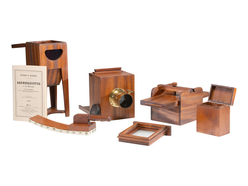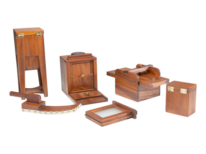 8 1/2 x 14 3/4 x 22 1/2 in. custom wood box containing a sixth plate daguerreotype outfit complete with sliding box camera with lens, fuming box, mercury bath, buffing stick, and plate box. Custom box, top signed on the side "R.W. Lisle, 1988." The camera is the largest object, size 6 in. wide x 7 in. high x 10 in. deep (not including lens).