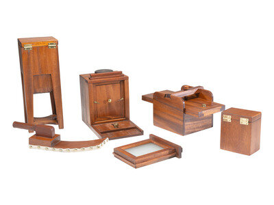 [CAMERAS]. Sixth plate daguerreotype outfit in custom box made by Robert Lisle, 1988.