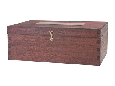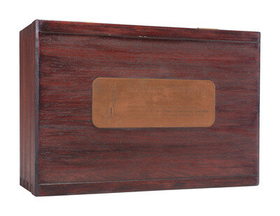 3 3/4 x 6 3/4 x 9 3/4 in. custom wood box containing a miniature daguerreotype outfit complete with camera, focusing screen, darkslide, coating box, fuming box, spirit lamp, and buff stick. With brass label on top of box identifying the "Daguerreotype Outfit No. 6," which was handmade by Ake Hultman, Sweden, 1999. Accompanied by paperwork from Mr. Hultman describing the contents of the outfit in more detail. The camera is the largest object, measuring 3 1/2 x 2 x 1 1/2 in.