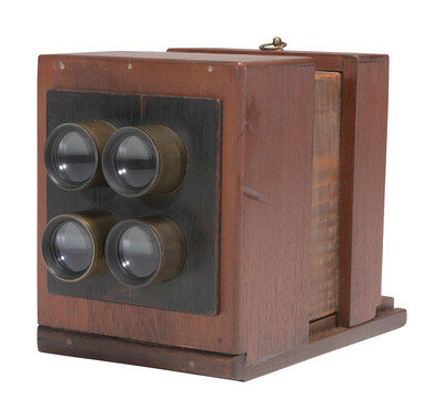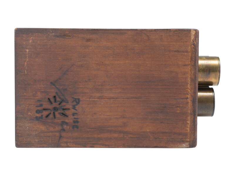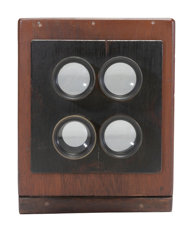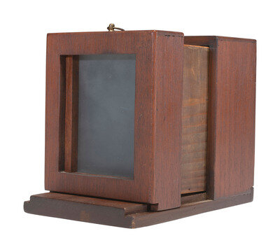 Replica, small 4-tube sliding box camera handcrafted in wood with 2 3/4 x 4 1/4 in. ground glass, size 5 in. wide x by 6 1/4 in. high x 7 3/4 in. deep. Underside signed, "R.W. Lisle, 1983." Accompanied by modern copy print.