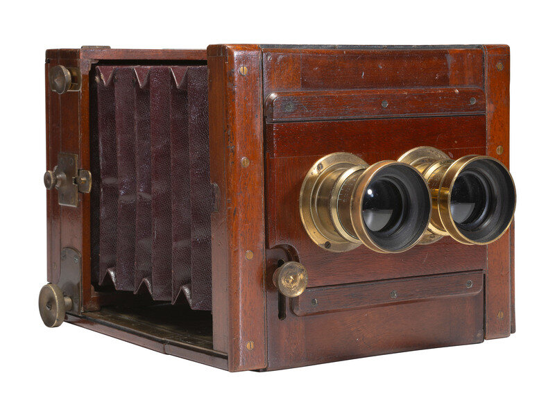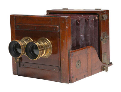 [CAMERAS]. English stereo tailboard camera with matching brass lenses.