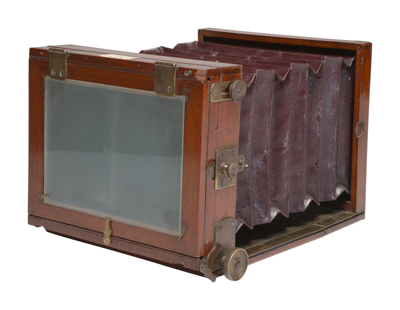 English stereo tailboard camera with wooden body, with manufacturer's label, "The Photo Artists Stores, 43 Charterhouse Square, London." With bellows that appear to be in very good condition considering age. The matching brass lenses are unmarked (one missing rear element). 9 1/2 x 8 1/4 x 7 1/4 in. when fully extended.