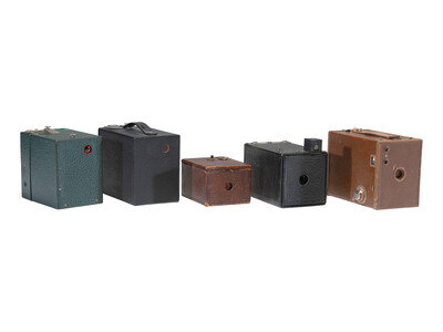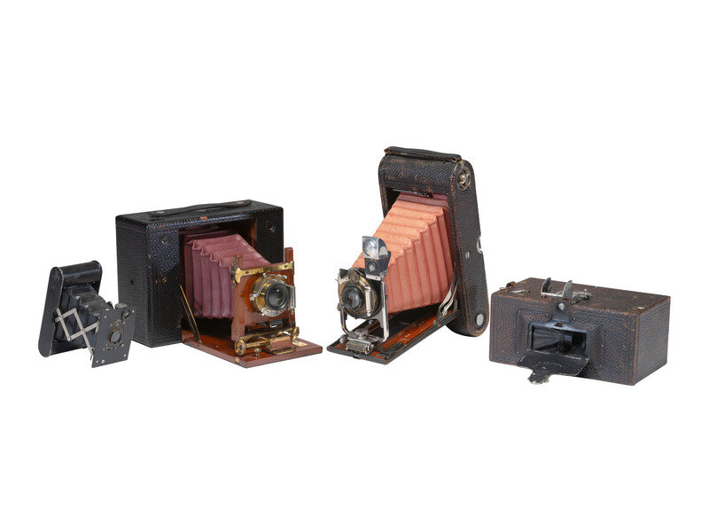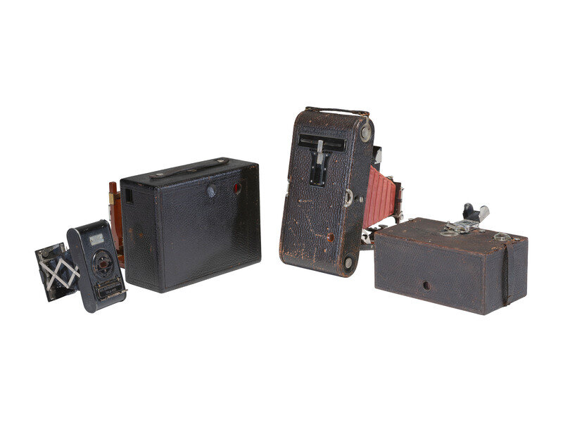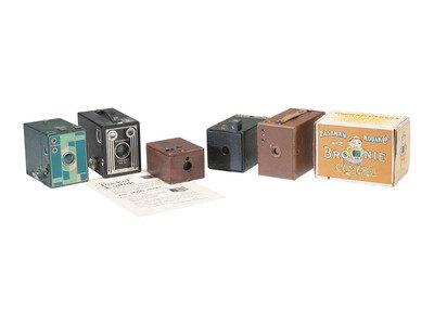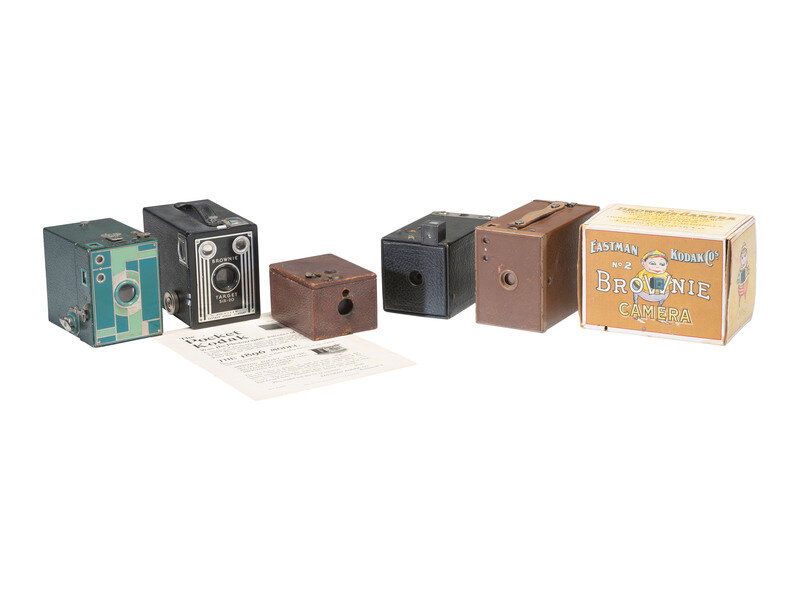 Pocket Kodak camera (some surface wear throughout). Size 4 x 3 x 2 1/4 in. Ca 1895-1900. With printed advertisement for the Pocket Kodak and three rare mounted photographs taken with the camera. -- No. 4 Cartridge Kodak camera (bellows in very good condition, some scuffing and surface wear to camera). Size 9 x 8 x 6 1/4 in. when fully extended. Ca 1897-1907. -- No. 1 Panoram Kodak camera (scuffing and wear to surface throughout). Size 7 1/4 x 4 1/4 x 3 1/2 in. Ca 1900-1926. -- No. 3A Folding Pocket Kodak camera (bellows in good condition with some spotting throughout, scuffing and surface wear to camera). Size 9 1/2 x 8 1/2 x 4 3/4 in. Ca 1903-1915. -- Vest Pocket Autographic Kodak camera (bellows in very good condition, some surface wear to camera). Size 4 3/4 x 4 x 2 1/2 in. when fully extended. Ca 1915-1926. Accompanied by two real photo postcards. -- No. 1 Brownie camera with viewer and film (some light surface wear). Size. 5 x 3 1/8 x 3 in. Ca early 1900s. -- No. 2 Brownie camera with original box (light surface wear to camera, case overall very good with expected handling wear). Size 5 3/8 x 4 x 3 in. Ca 1901-1933. -- Brownie Target Six-20 camera (minor wear to surface). Size 5 x 4 x 3 in. Ca 1946-1952. -- Beau Brownie camera in Art Deco, two-tone color combination of green (minor surface wear, overall very good). Size 4 1/4 x 4 x 3 in. Ca 1930-1933. Green was only made over a period of 3 months.
