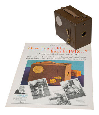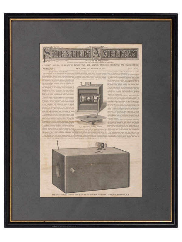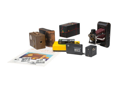 [With:] George Eastman portrait medallion, diameter 3 in. -- 40+ printed advertisements for various photography companies, including Kodak, Rochester Optical Co., Lancaster & Son, Rolleiflex, and many others, most clipped from publications, some printed in color. -- George Eastman: A brief biography of the founder of Eastman Kodak Company booklet. -- Original Kodak catalogs for 1900, 1907, and 1928, and manual entitled How to make Good Pictures, published by Eastman Kodak Co., Rochester, NY. -- Brownie Year Book published by Charles E. Tuttle Company, 1988. -- Kodak EK6 Instant Camera advertisement on board. -- 6 large folded boxes for Kodachrome, Ektachrome, and Kodacolor II film, possibly made for display purposes. -- Eastman Kodak Co., Rochester, NY short glass. -- Kodak-themed toy cars in original packaging. -- Scientific American pages featuring illustrations of Kodak cameras, framed.