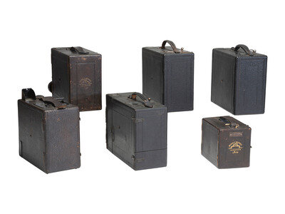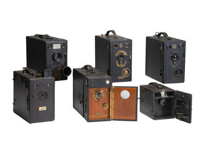 Patent camera with open door mahogany face, brass trim, and bellows feature. Size 9 1/4 x 7 x 4 in. -- Murer's Express Newness camera, J.B. Borrey, Geneve, smallest version. Size 5 3/4 x 4 1/2 x 3 1/2 in. -- Murer's Express Newness camera, Photo-Hall, Paris, open face reveals shutter mechanism. Size 8 1/2 x 7 x 4 1/4 in. -- Patent camera, J. Lizars Optician, Union Street, Aberdeen. Size 7 1/2 x 7 x 4 in. -- "The Midg" camera with brass trim on face. Size 8 1/2 x 7 x 4 in. -- "The Midg" camera. Size 8 x 7 x 4 in. With original "Instruction Card" and box.