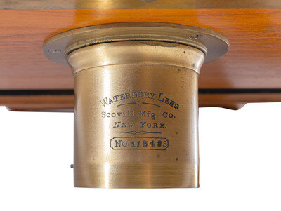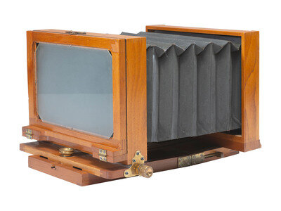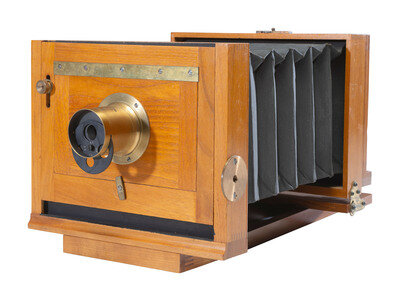 F. Putnam Company. New York, NY, ca 1885-1895. This example of the Putnam Marvel is a 5 x 8 in. horizontal tailboard camera of light-colored wood. The remarkable thing about this camera is that the cabinetry has no maker’s name or production number stamped into the wood as most others did. It comes with its original sturdy wooden box and a Waterbury lens (No. 115493), made by the Scovill Manufacturing Co., New York. The lens has wheelhouse stops as its aperture and a leather lens cap.